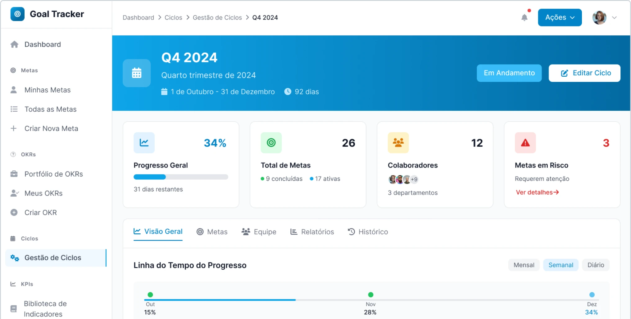 O módulo de Ciclos organiza o trabalho por períodos mensais, trimestrais ou anuais, permitindo acompanhar resultados ao longo do tempo e gerar relatórios automáticos, criando um fluxo constante de planejamento e melhoria.
