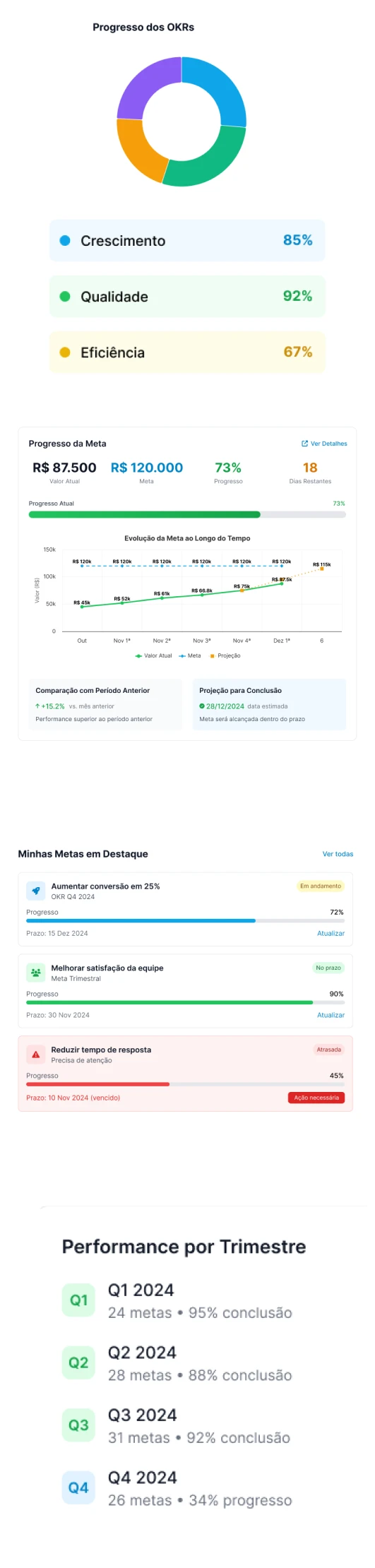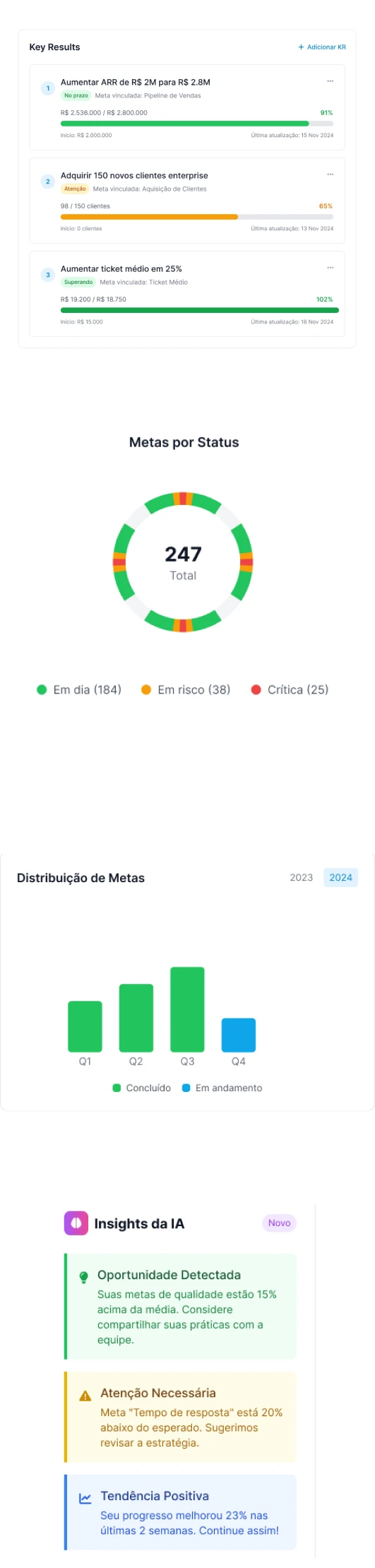 O módulo de OKRs do seu software de IA ajuda seus futuros clientes a definirem e acompanharem seus objetivos estratégicos com clareza, foco e inteligência, automatizando o cálculo de progresso, identificando riscos e sugerindo ações para garantir que cada meta chegue ao resultado certo.
